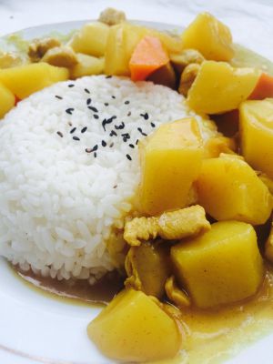将煮好的咖喱浇在米饭上,一道美味的咖喱鸡饭就做好啦。P.S.喜欢摆盘的亲们可以将米饭用小碗盛,倒扣于盘子上,撒些黑芝麻