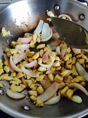 把鸡腿肉倒入,中小火翻炒至鸡肉完全变色。
