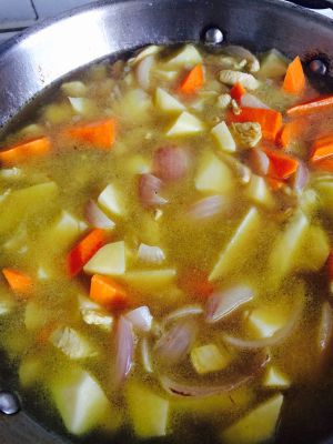 待土豆丁变白时,加入400ML高汤,煮沸后调中火煮10min。