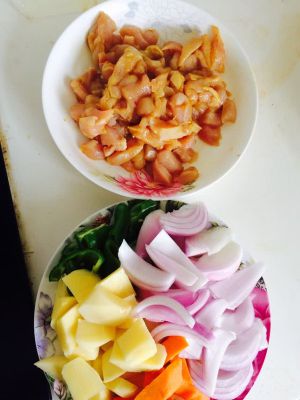 先将鸡腿肉用料酒腌制,土豆,胡萝卜,洋葱切丁备用
