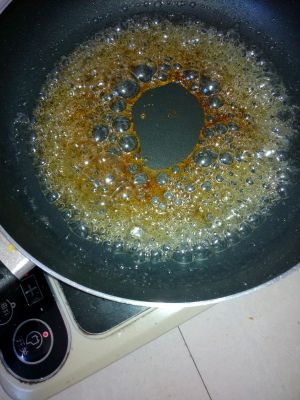 把备好的60g白糖和水加入平底锅中,小火熬边熬边搅拌,至图片颜色迅速倒入备好的小布丁瓶里,不然凉了就硬了不好倒。
