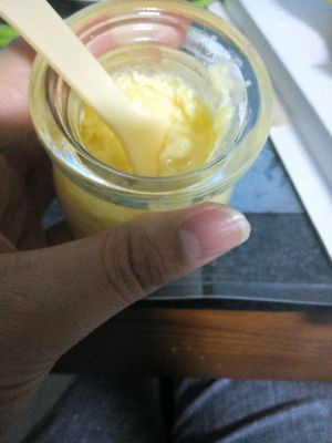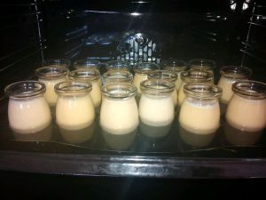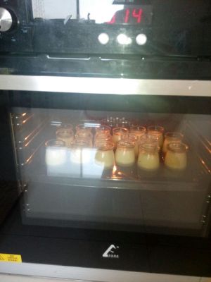 然后把奶粉黄油合剂倒入瓶内放烤箱即可,前提烤箱已经预热至170度,注意烤盘中一定记得加热水,不溢出烤盘就可以。