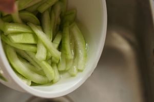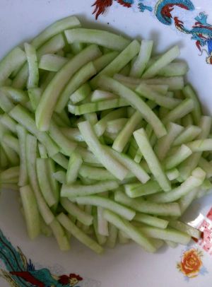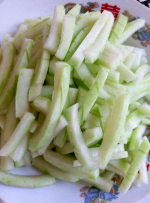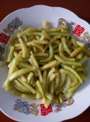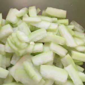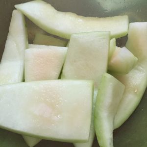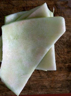 将西瓜皮最外面那层硬硬的翠衣用刨子刨下来,剩下淡绿色的西瓜皮部分,然后冲洗干净并沥干。