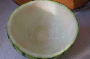 将西瓜内的红瓤全部挖出,只剩下西瓜皮。