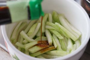 在西瓜皮的碗内倒入薄盐生抽,再淋上1小勺麻油,拌均匀就可以吃了。