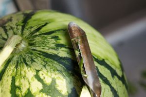 西瓜里面的红囊刮干净,外面的绿皮用刨子刨去。