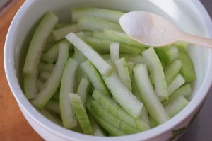 用少量盐腌制后的西瓜皮会析出水分,将析出的水分倒掉。