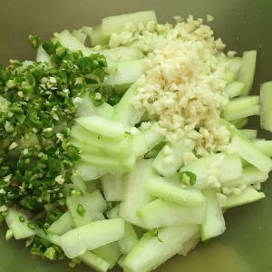 将去皮的瓜皮切成丁,放进碟内。加入寿司醋、细砂糖、蒜末、盐