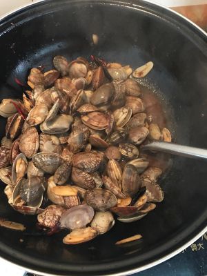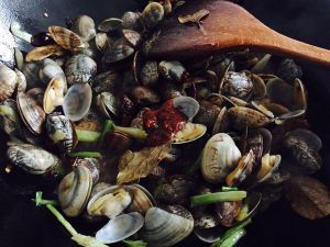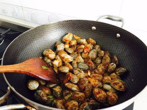 放入豆瓣酱翻炒,倒入花蛤,继续翻炒,期间放入少量盐巴、料酒、红烧酱油,继续翻炒,当花蛤都张开口即可