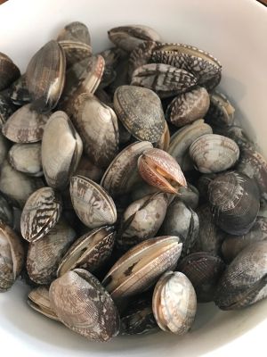 买吐沙差不多的活花蛤,用不锈钢盆使劲掂几遍,将剩余泥沙掂出来,死花蛤会掂碎,用水洗干净。