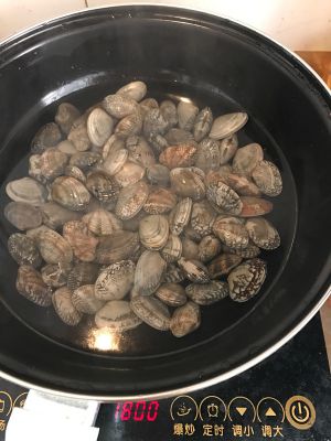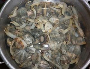 准备材料期间烧一锅开水,水开之后把花蛤放进去煮1分钟左右,等它们都张开口。然后捞出来过去再清洗一下。