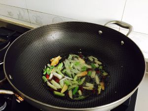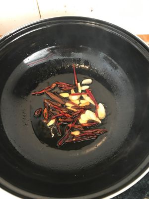 放入八角,香叶,干辣椒,香葱,炒出香味。