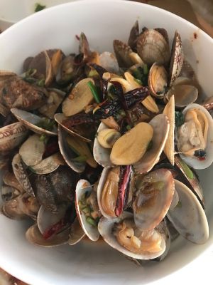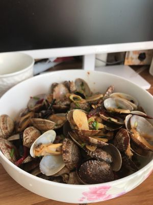 放油,油温热之后放适量豆瓣酱,炒几下之后放进去葱姜蒜爆香,然后把花蛤从清水里捞出来倒进锅内翻炒,倒入适量耗油,白糖,生抽,(基本上不用再放别的调料了)