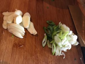 蒜切片,葱切碎,干辣椒丝、香菜末备用