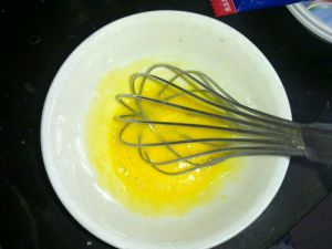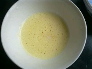 用打蛋器将蛋液打发,全蛋不易打发,最好把打蛋盆放在40度左右的温水中打发,打发到提起打蛋器,蛋液流下来的纹路不会很快消失就可以了。