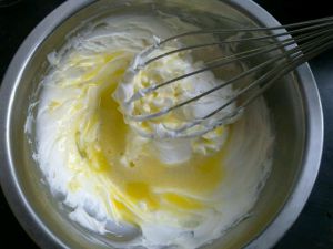 把奶酪用打蛋器搅打顺滑,把第8步准备好已经冷却的蛋黄糊和奶酪混合均匀。