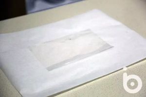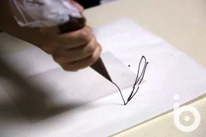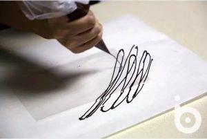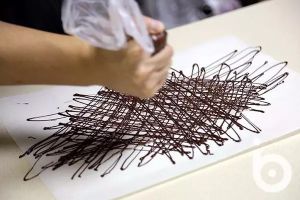 ⑦将剩下的调温巧克力填入一个裱花袋中,剪一个小口,以左斜、右斜、横、竖的手法挤在一张玻璃纸上(玻璃纸下边垫上一张更大的油纸,方便清理)