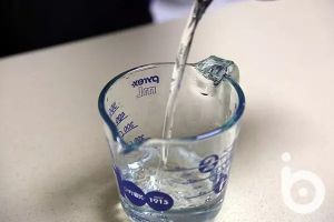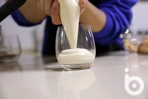 ⑤将冷冻好的白朗姆酒倒入一个较大的量杯之中(白朗姆酒可用二锅头代替),将少许调温好的巧克力糊填入裱花袋中,以画圆的手法挤入白朗姆酒中
