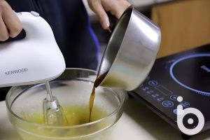提拉米苏体部分: ①将120g糖酒水与细砂糖混合煮沸,分次冲入到蛋黄之中,并用打蛋器高速抽打蛋黄,防止蛋黄受热凝固