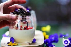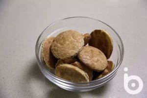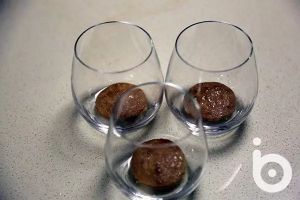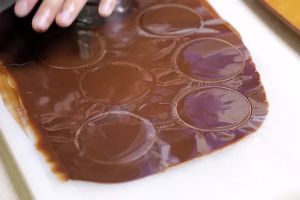 ④待巧克力薄片凝固后将其取出,揭下表面的玻璃纸,用加热过的圆形饼干切模在巧克力薄片上切出与玻璃杯杯口大小近似的巧克力圆片,备用