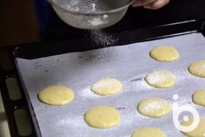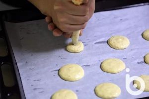 ⑥将制作好的面糊填入裱花袋中,挤在铺有油纸的烤盘之中(大约可挤12个),筛上少许糖粉