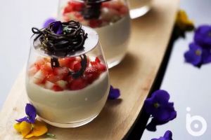 ⑨将冷藏好的巧克力网取出,用加热过的刀将巧克力网切成小段 ⑩将草莓切成小丁儿,撒在提拉米苏的表面,将切成小段的巧克力网插在提拉米苏的中间,盖上巧克力圆片,放上巧克力鸟巢并弹上少许金粉装饰,即可完成