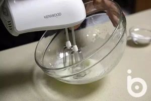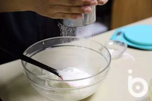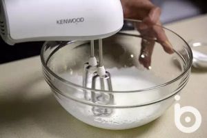 ③将剩下的30g细砂糖与食盐混合拌匀,分3次加入到步骤①的蛋白之中,打蛋器中高速将蛋白打至硬性发泡的状态