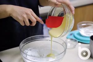 ④将步骤②中的蛋黄糊加入到步骤③的蛋白之中,用刮刀混合拌匀