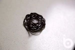 ⑥因为朗姆酒经过冷冻还是液体状,将巧克力糊挤入朗姆酒中,巧克力会凝固定型,成为鸟窝一样的造型。将巧克力从酒中捞出,放在油纸上备用