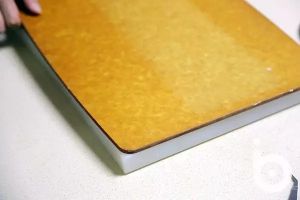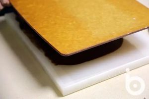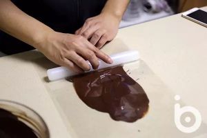 ③将适量巧克力糊倒在一张较大的玻璃纸上,在巧克力糊上盖上一张玻璃纸,用擀面杖将巧克力糊推开,成为巧克力薄片,用重物压平,送入冰箱冷藏备用