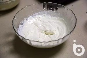 蛋清打发至出现小泡沫后加入5g细砂糖,继续打发至泡沫细腻,在加入5g细砂糖打发,打发后放入冰箱里