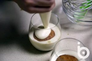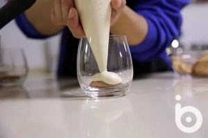 ⑤将肉松手指饼干泡入剩下的糖酒水中,将一片手指饼干放入玻璃杯的底部,填上一层提拉米苏奶酪糊