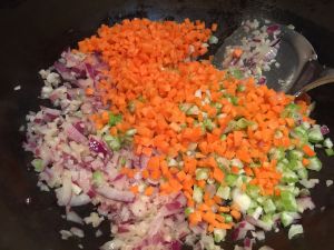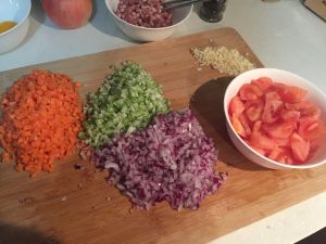 将胡萝卜 西芹洋葱 西红柿 蒜 切末备用