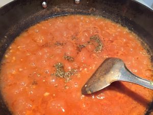 再加入蕃茄沙司、适量的盐、黑胡椒粉和意大利综合香草