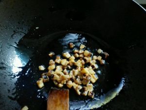 比一般炒菜的油少量,先把肥的腊肉煸炒一下。