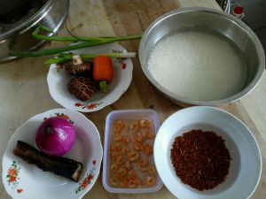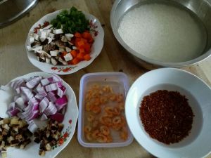 大米,红粳米按蒸饭需要的水量泡好,各种食材切成均匀的粒。