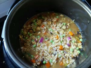 打开盖子,用饭勺上下翻动,将米饭与所有的食材混合在一起,即可装碗开吃。