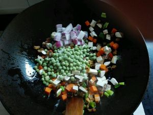 倒一点油打入鸡蛋划散,蛋8成熟时倒入饭,加盐一起炒,加入煮熟的青豆和上面炒好的洋葱什么的一起倒进来,一起翻炒,加调味料,装盘.