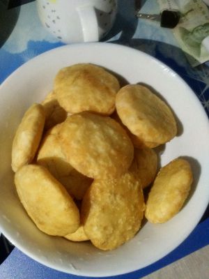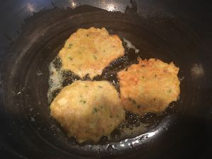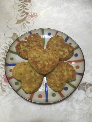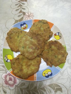 首先把土豆放锅里煮熟,然后做成泥,加入蛋液,生粉,盐,味精,做成小饼样,锅里油烧热,放锅里炸到金黄色起锅装盘。这个步骤我没拍下来。