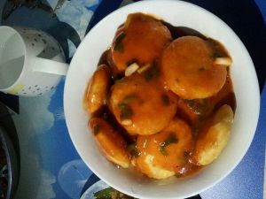 锅里在倒水,放番茄酱,糖,生粉水烧开放葱花,就可以了。