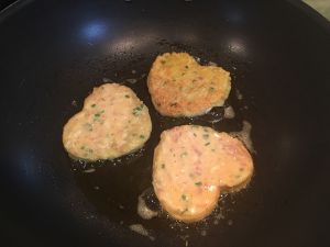 不粘锅烧热,倒入少量的菜籽油,我用了黄豆油!放入模具,用勺子挖面糊放在模具里,记得一直都用小火,不要放太满!