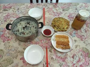 然后就是用大汤勺,一勺一勺的放入锅里煎。开小火,这样你可以从容的放入材料,而且鸡蛋很容易吸油,所以少放点油,开小火也不容易焦掉。 右上就是土豆饼,刘先生回来晚了粥煮完了盖盖子闷了太久了都变色了(/ω\)