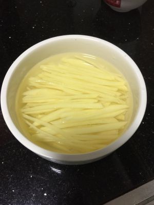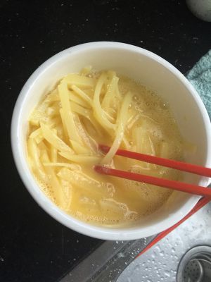 土豆切丝,建议用小一点的土豆,我做的时候家里的土豆大概和爱疯5差不多大,然而做两人份还是多了。切丝之后放在水里防止氧化,之后煮开水放进去稍微煮一煮即可。