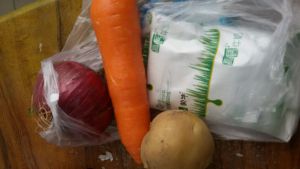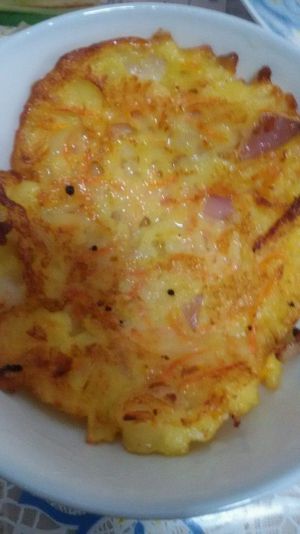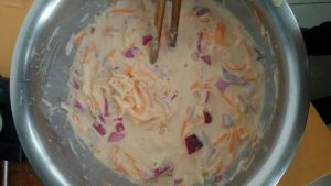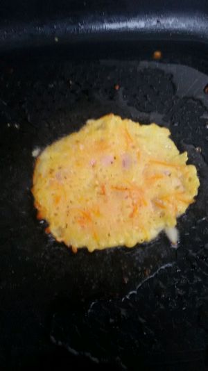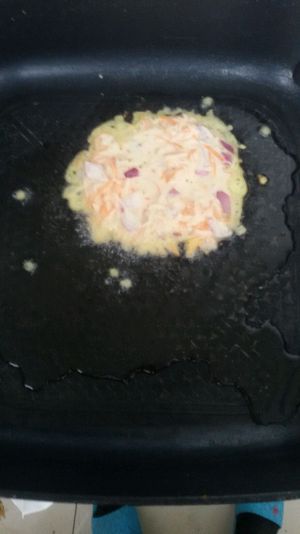 洋葱切丁,土豆胡萝卜切丝(注意土豆容易氧化所以最后切,不要用水冲洗,要保住淀粉),加鸡蛋牛奶和面粉调成糊状,注意不要太稀否则不成型,所以牛奶不用太多,然后放作料调味儿