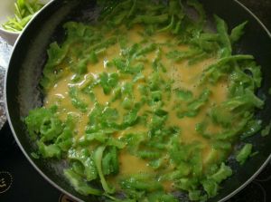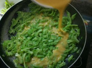 油热锅,倒入苦瓜翻炒。待苦瓜快熟时浇入打好的蛋液,翻炒均匀,加盐调味即可。上盘。