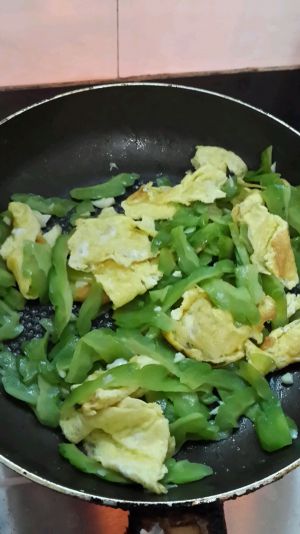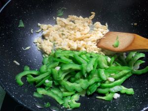 随后把苦瓜放入少量的油炒到几乎熟透就把鸡蛋倒进去加入盐 酱油翻炒一分钟