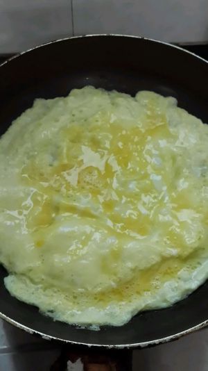调慢火,在苦瓜上面加蛋液,煎成蛋饼。