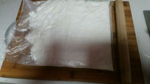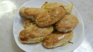 (包东西手黏,没办法拍照了)白面,糖,猪油,水,放一起,和成水皮,白面,猪油和成油酥面,把水皮和油皮都赶成片,油皮放水皮上,从上往下卷,切成小块,包上馅,搓成长形,轻按一下,烤盘放油纸,把做好的胚子摆好。