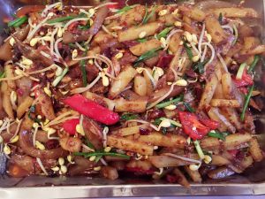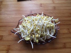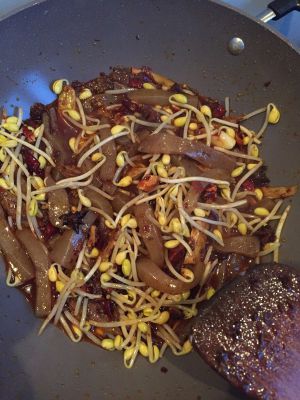 再加入焯过水的土豆、黄豆芽翻炒均匀,加入适量生抽。