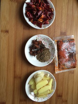 干辣椒,八角,孜然粒,生姜切片,大蒜拍碎
